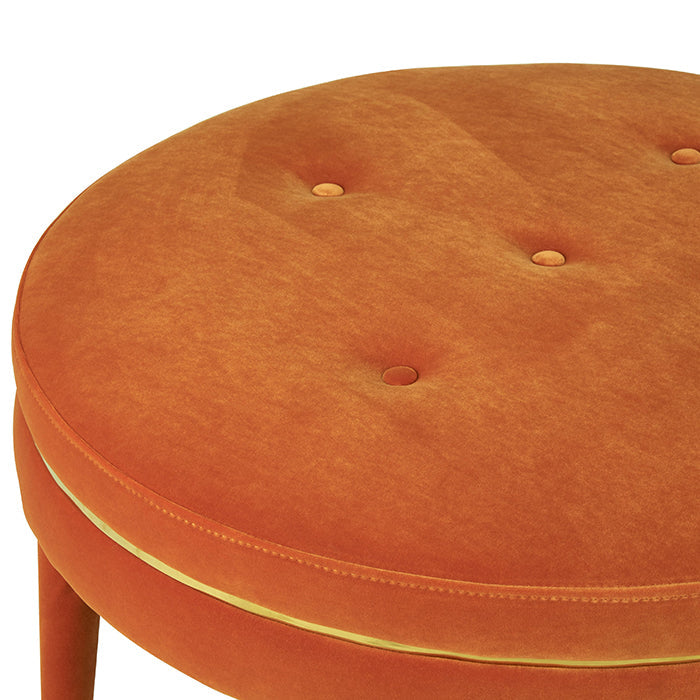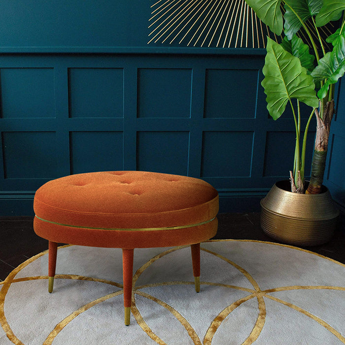 The Oxford orange velvet footstool is beautifully shaped with an elegant look to it. The top of the round Oxford velvet footstool is buttoned in the same fabric with a gold stainless steel band around the middle for extra pizzazz. The legs are made with renewable rubberwood feet, and at 49cm high it's the perfect height for resting your feet on soft velvet, you just might find yourself lounging longer than planned
